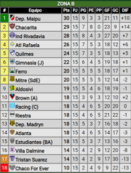 Por la fecha 15 de la Zona B, Gimnasia de Jujuy venció 2 a 1 a Atlanta en condición de visitante. Los goles para el elenco de Mario Gómez los hicieron Federico Brandan (42m PT) y Abel Argañaraz (26m ST), mientras que para la visita lo realizó Eugenio Olivera (39m ST) .