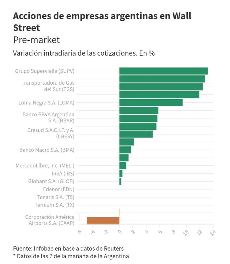 En una jornada caracterizada por la respuesta favorable de los mercados ante los resultados electorales en Argentina, los American Depositary Receipts (ADRs) de compañías de Argentina que cotizan en Wall Street registraron un destacado aumento en sus acciones durante las operaciones del pre-market.