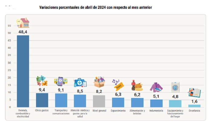 Durante abril el que tuvo mayor aumento y por lejos con respecto a los otros fue Vivienda, combustible y electricidad con el 48,4%, y el sigue el rubro Transporte y comunicaciones con el 9,1% y le sigue más abajo, Atención médica y gastos para la salud 8,5%.