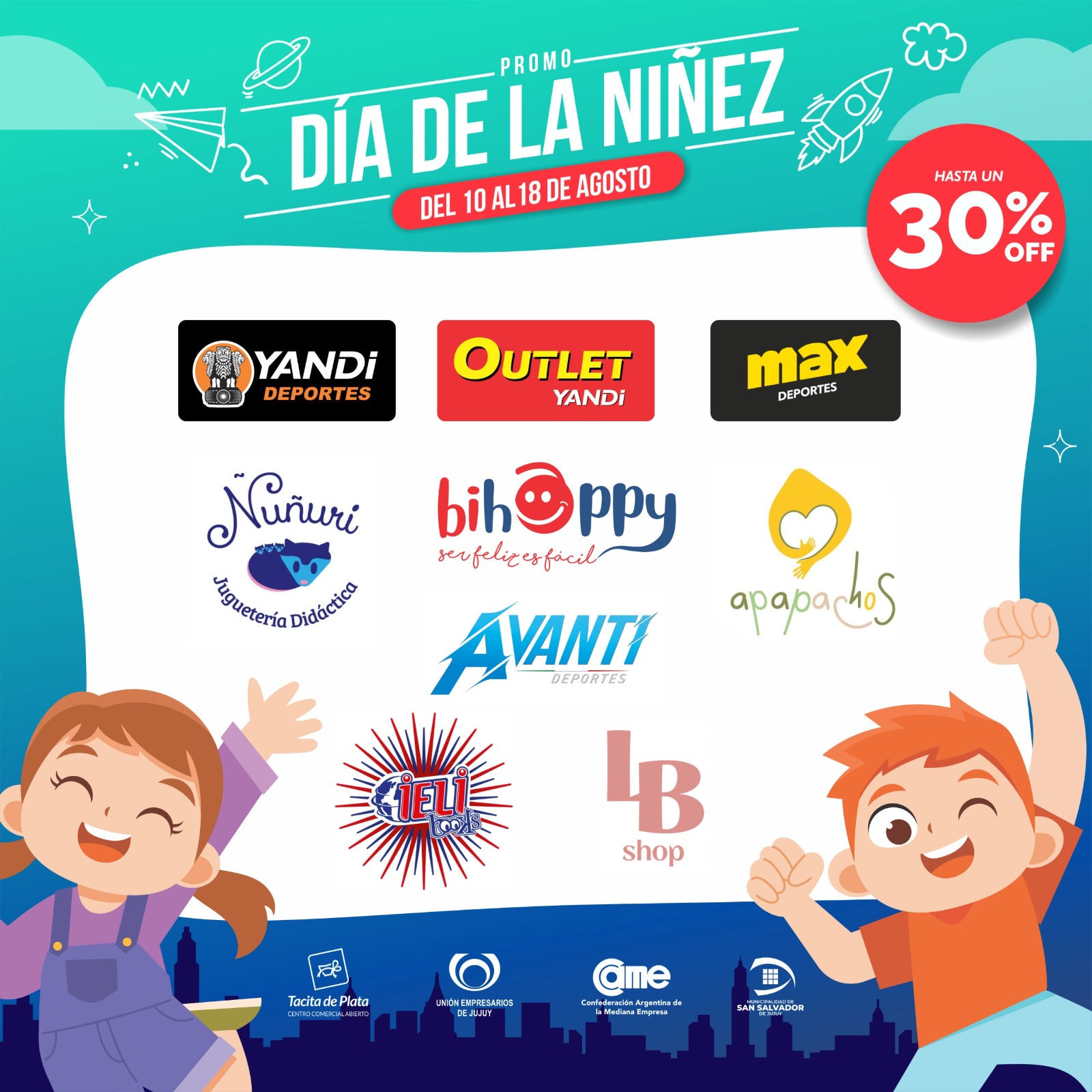 La Unión Empresarios de Jujuy, a través del Centro Comercial Abierto “Tacita de Plata”, junto a la Confederación Argentina de la Mediana Empresa (CAME) y la Municipalidad de San Salvador de Jujuy, invitan a la sociedad en general a aprovechar las promociones en comercios de Jujuy para el día de la niñez 2024.