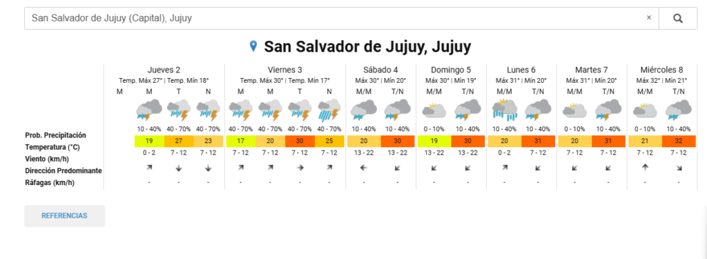 - Jueves 2: Se espera una máxima de 27°C y mínima de 18°C, con probabilidades de precipitación entre el 10% y el 70%. El viento será moderado, con ráfagas de hasta 12 km/h. La dirección del viento predominante será de sureste.