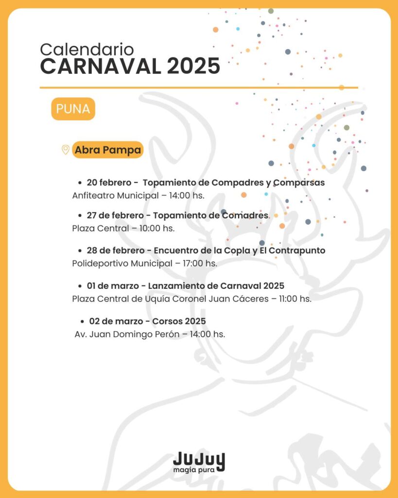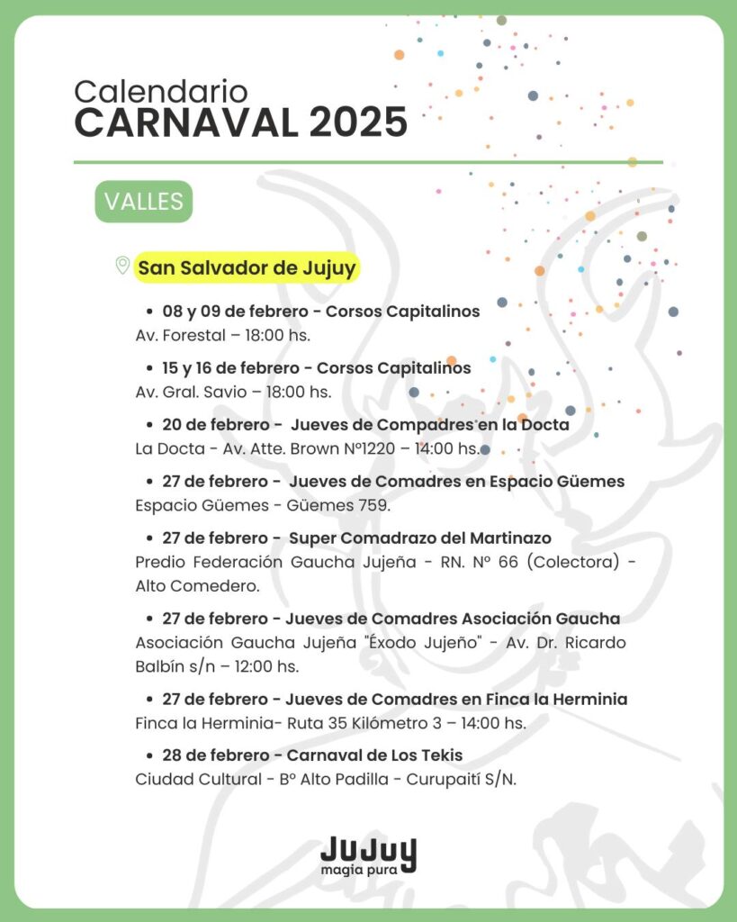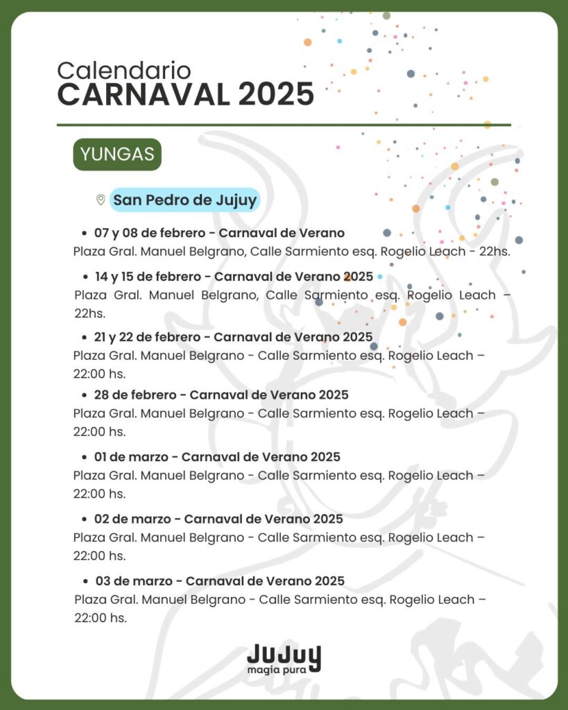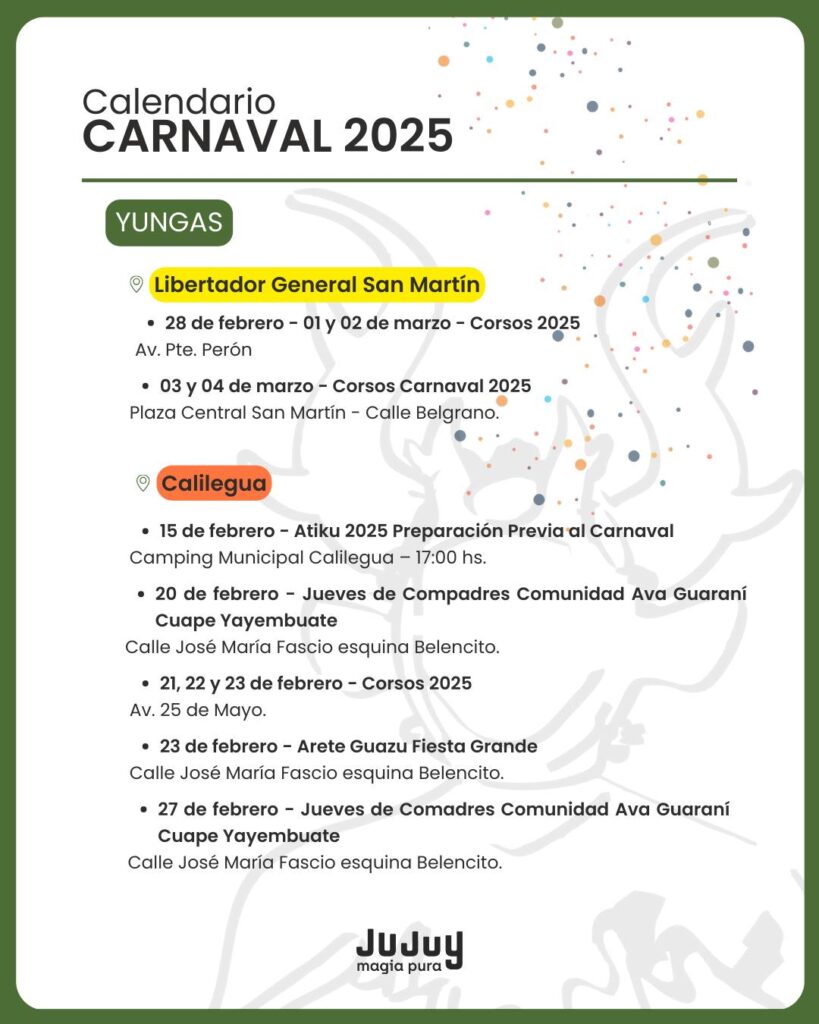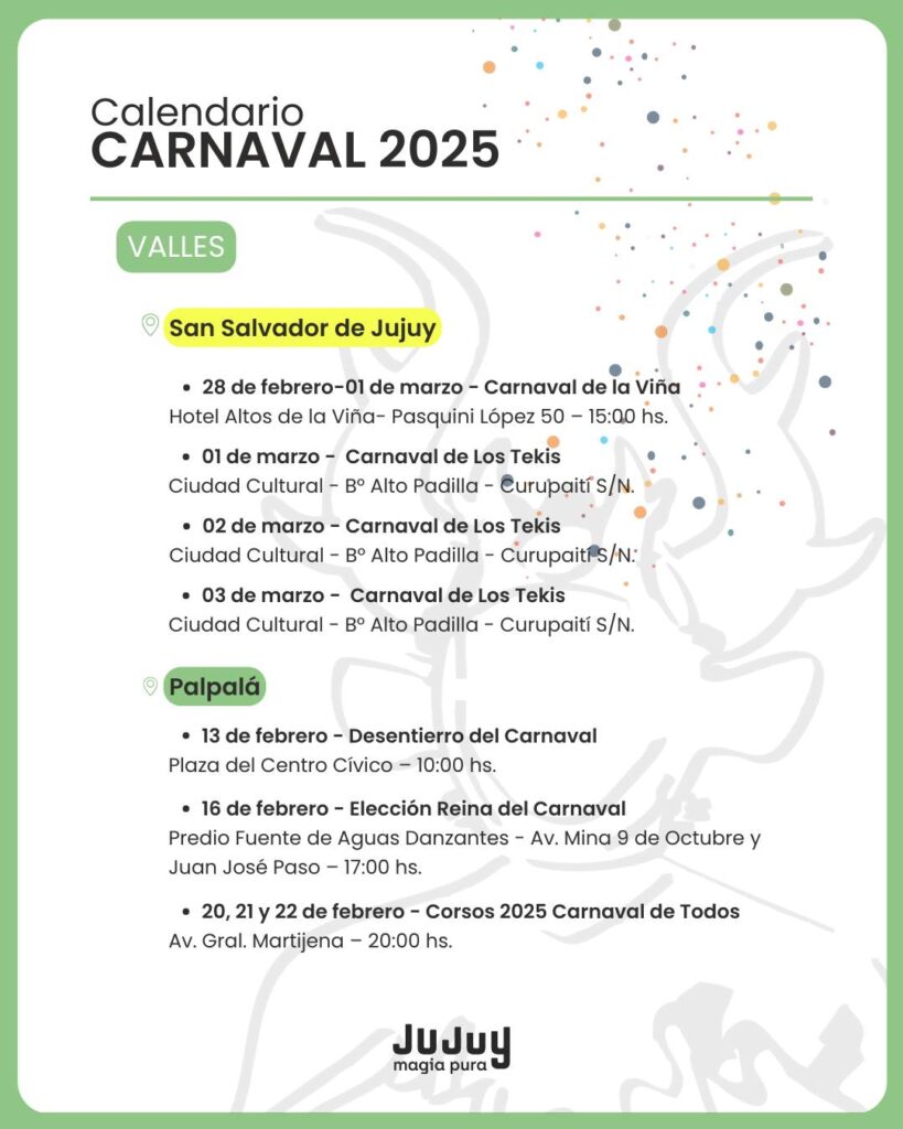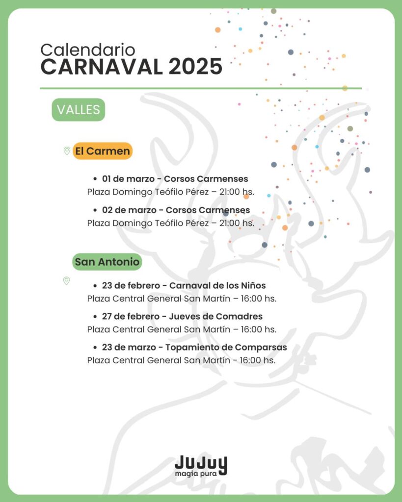 El Gobierno de Jujuy dio a conocer este miércoles la programación oficial del Carnaval 2025, con actividades que recorrerán las cuatro regiones de la provincia. Desde la Quebrada hasta las Yungas, pasando por los Valles y la Puna, la fiesta más esperada del verano contará con una agenda repleta de eventos tradicionales, desentierros, comparsas y celebraciones populares.