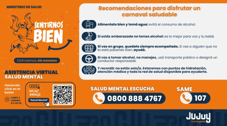 “Sentirnos bien” es una estrategia sanitaria integral que ofrece recomendaciones simples y efectivas para cuidar la salud, además de contar con la presencia de equipos de salud mental y profesionales del SAME 107 durante las festividades. Los mismos estarán disponibles del 28 de febrero al 3 de marzo en la Ciudad Cultural de la capital jujeña, brindando apoyo a los participantes y ofreciendo consejos sobre hábitos saludables y prevención de riesgos.