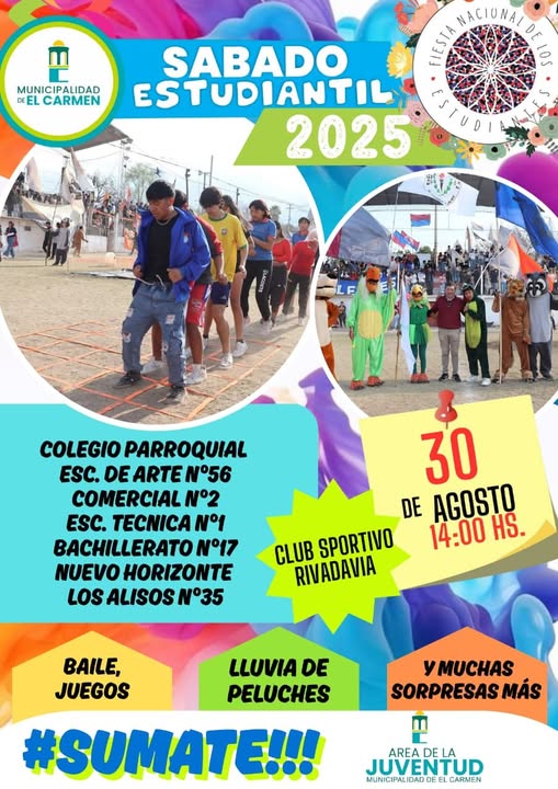 Carmen , los invita a formar parte del SABADO ESTUDIANTILen esa ciudad, desde las 14 en el Club Sportivo Rivadavia.