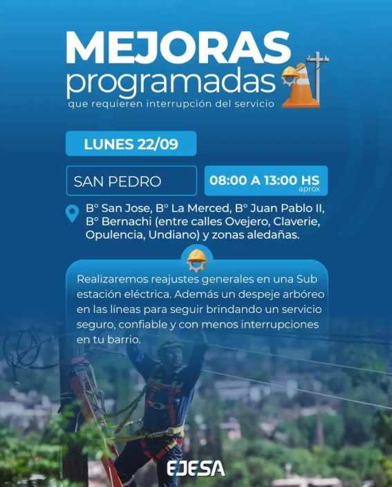 La empresa distribuidora de energía EJESA informó que el próximo lunes 22 de septiembre se llevarán a cabo mejoras programadas en el servicio eléctrico en la ciudad de San Pedro de Jujuy, lo que requerirá la interrupción del suministro entre las 08:00 y las 13:00 horas aproximadamente.