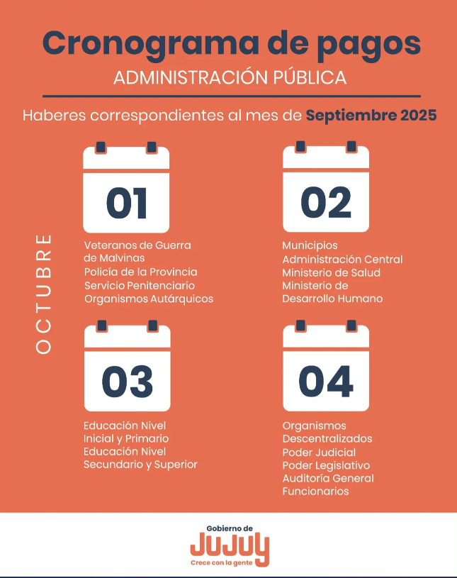 Por último, el sábado 4 de octubre, se les efectivizará sus haberes a Organismos Descentralizados, Poder Judicial, Poder Legislativo, Auditoria General y Funcionarios.