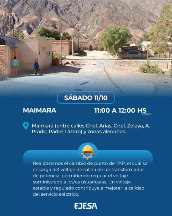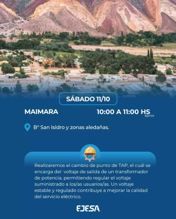 Este sábado 11 de octubre, EJESA llevará adelante mejoras programadas en el servicio eléctrico de Maimará. Según detalló la empresa, los trabajos se desarrollarán en dos etapas durante la mañana y demandarán cortes momentáneos del suministro.