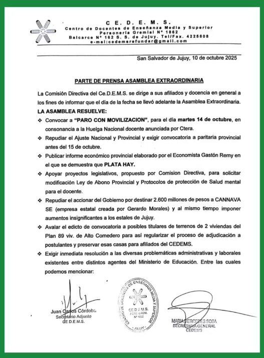 Además, el sindicato repudia el Ajuste Nacional y Provincial y exige convocatoria a paritarias antes del 15 de octubre.