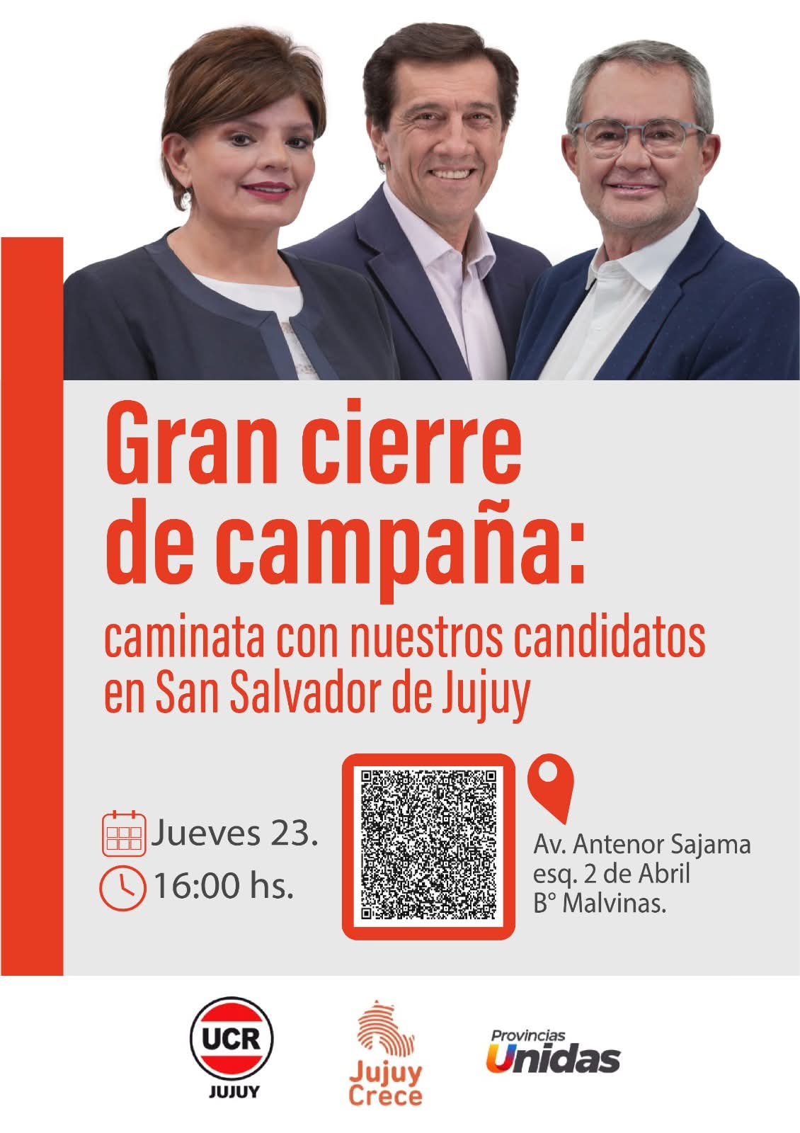 Caminata de cierre de campaña de Jujuy Crece en San Salvador, este jueves 23, a las 16, en las afueras del Complejo Ministerial del B° Malvinas, con la presencia de los candidatos a diputados nacionales, María Inés Zigaran y Mario Pizarro