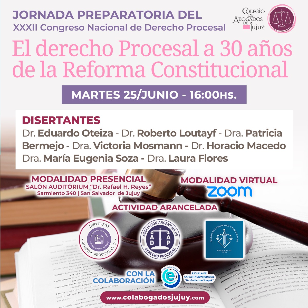 El Colegio de Abogados y Procuradores de Jujuy informa la realización de la JornadaPreparatoria del XXXII Congreso Nacional de Derecho Procesal “El Derecho Procesal a 30 años de la Reforma…
